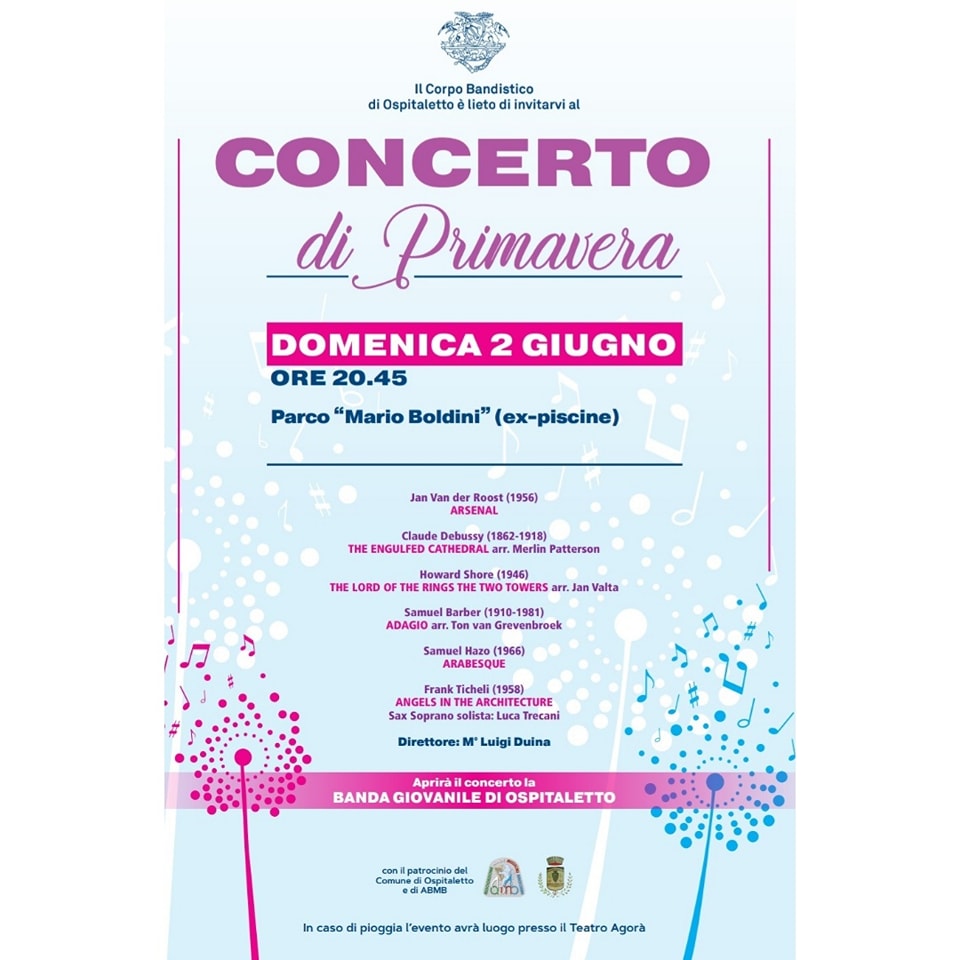 Domenica 2 Giugno ore 20:45 presso Parco “Mario Boldini” (ex-piscine) il Concerto di Primavera. Conduce il direttore M° Luigi Duina.