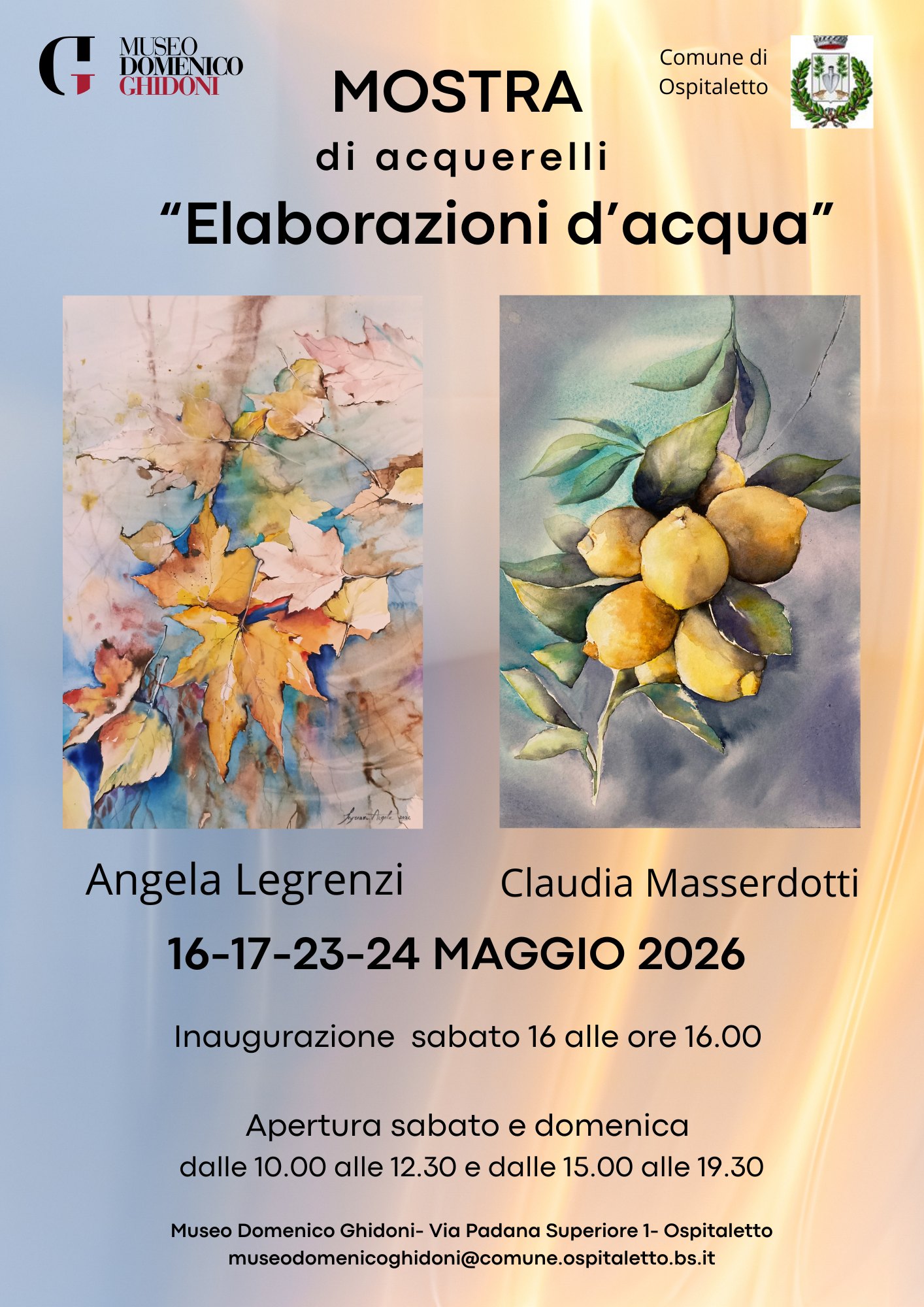Nei fine settimana del 16, 17 e 23,24 maggio sarà possibile visitare una mostra di acquerelli curata dalla nota artista ospitalettese Angela Legrenzi. L’inaugurazione è prevista per il giorno sabato 16 maggio alle ore 16,00. La mostra sarà aperta al pubblico il sabato e la domenica dalle ore 10,00 alle ore 12,30 e dalle 15,00 alle 19,30.
