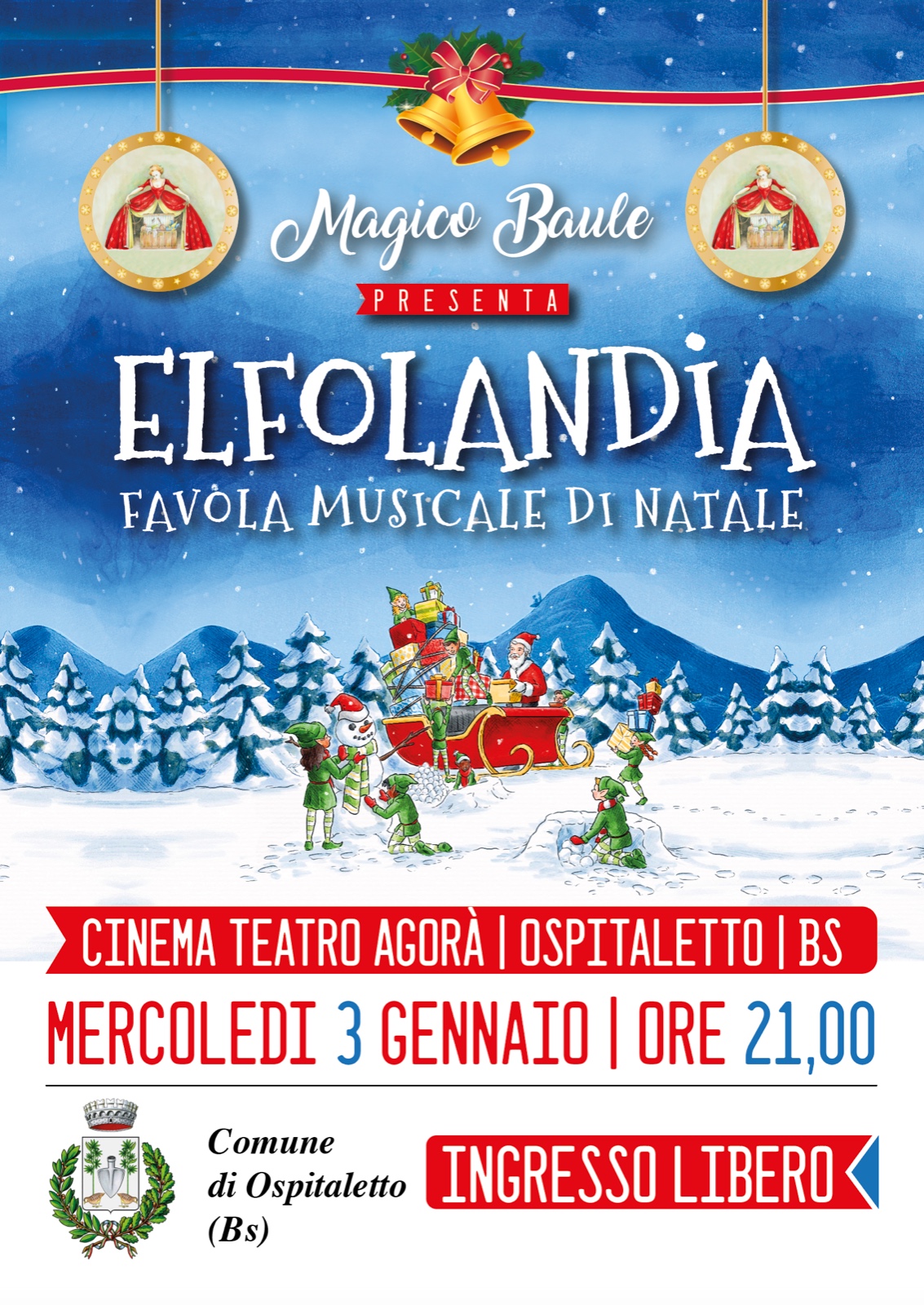 Mercoledì 3 Gennaio ore 21.00, presso il cinema teatro Agorà di Ospitaletto, si terrà Elfolandia: favola musicale di natale. L’ingresso è libero.