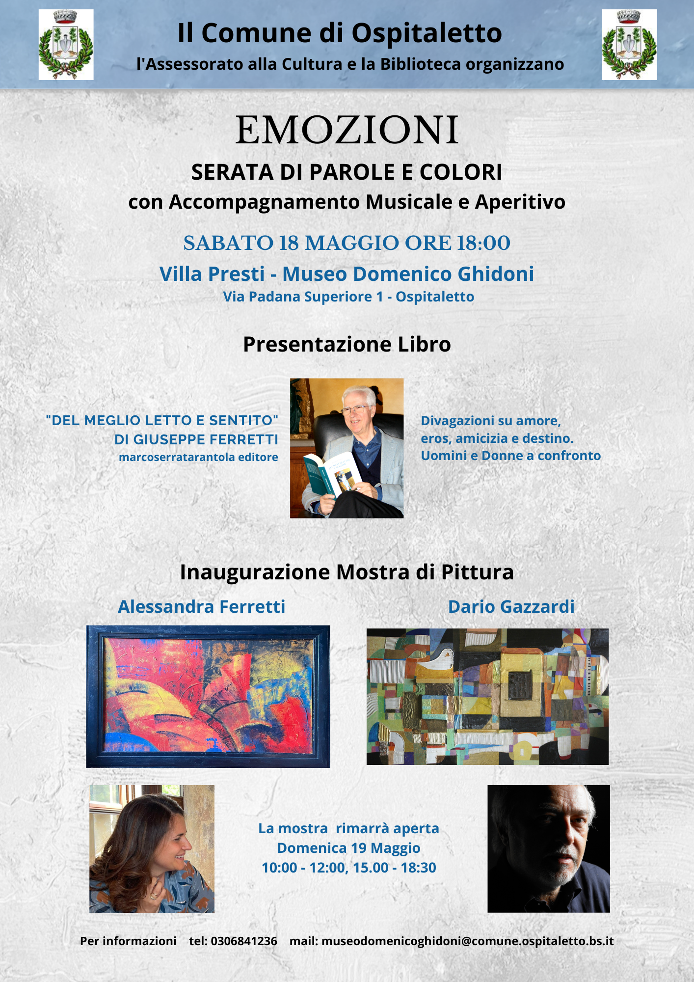 Si avvisa il pubblico Sabato 18 Maggio ore 18:00 presso Villa Presti - Museo Domenico Ghidoni "EMOZIONI, serata di parole e colori con accompagnamento musicale e aperitivo".